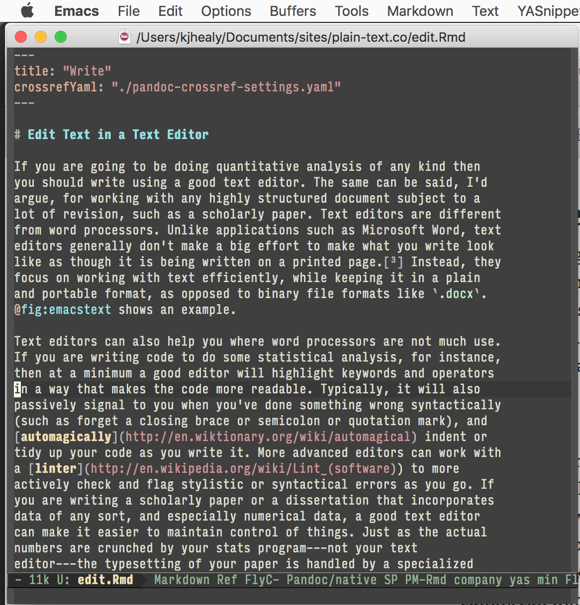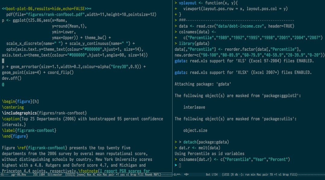 所有这一切的结果是使用 Emacs、ESS、R 和其他工具的强大编辑;使用 pandoc 的灵活转换;通过 HTML 和 Marked 的快速简便预览;以及同时(或按需)高质量 PDF 排版。所有这些都可直接从纯文本生成,并将包括大多数学术论文所需的几乎所有机制,最显著的是可在文本中交叉引用的正确标记的表格和图形。虽然以这种方式列出可能看起来相当复杂,但在使用中相当直接,使用时不需要任何思考。我就生活在我的文本编辑器中。各种脚本和设置安静地完成工作,我得到我想要的格式化输出。