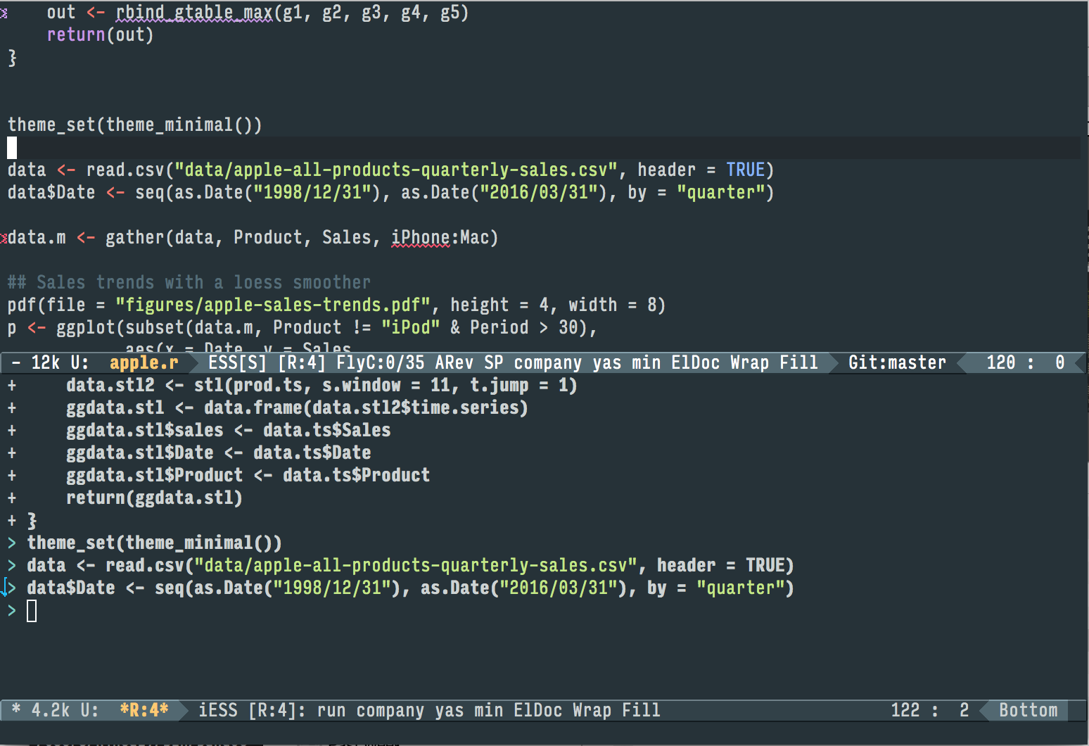Figure 3.2: Working with R in Emacs using ESS. A document containing R code is open in the top half of the screen. Below the divider, an R session is running, also inside Emacs. Code from the top pane is sent to the bottom with a keyboard shortcut, where it is evaluated by R. We can also jump down to the bottom pane and do work there. Small details like a lint checker, active line highlighting, and revision-control information are also visible.
