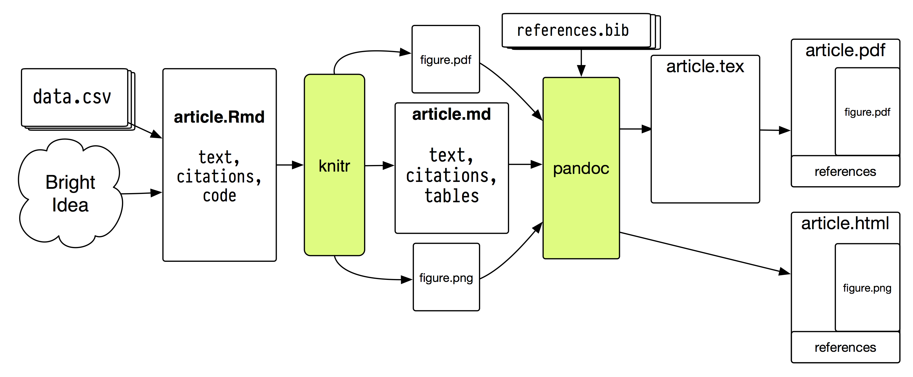 与此同时,在工程模式中,纯文本文件处于你工作的中心。项目中最“真实”的东西要么是这些文件,更可能是存储项目的版本控制仓库。更改在文件之外跟踪,同样使用版本控制系统。数据分析在代码中管理,以(理想情况下)已知且可重现的方式产生输出。引用和参考管理也可能以纯文本完成,如 BibTeX 的 .bib 文件。最终输出从纯文本组装,并使用某种排版或转换工具转换为 .tex、.html 或 .pdf。很多时候,由于世界上某些不可避免的事实,这种解决方案的最终输出也是一个 .docx 文件。
