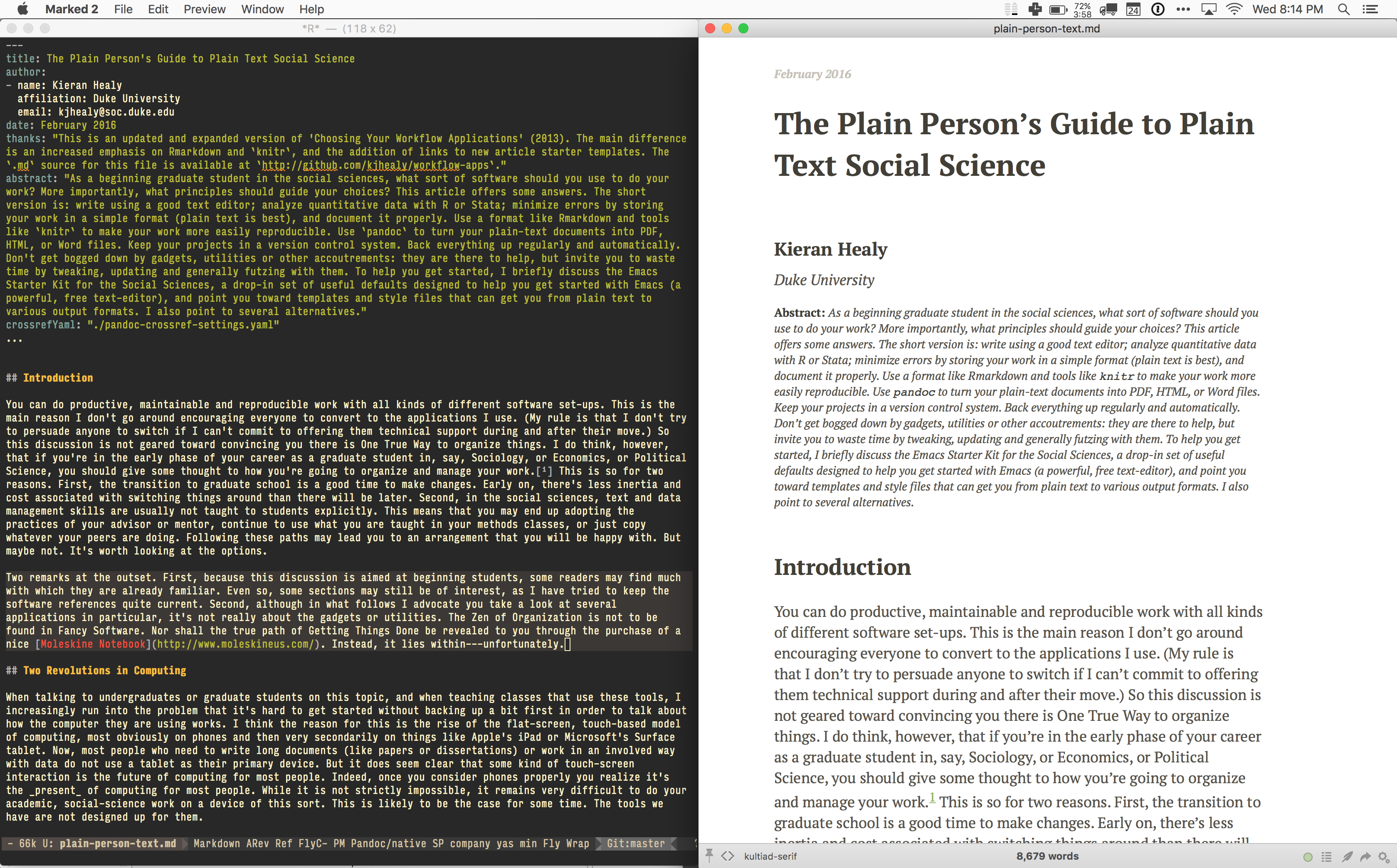 Figure 6.2: Working on this document in Emacs (left), with a live HTML version displayed in Marked (right).
